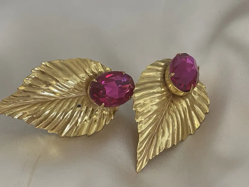 Vintage Miriam Haskell Fuchsia Dark Rose Rhinestone Gold Gilt Leaf Clip On E
