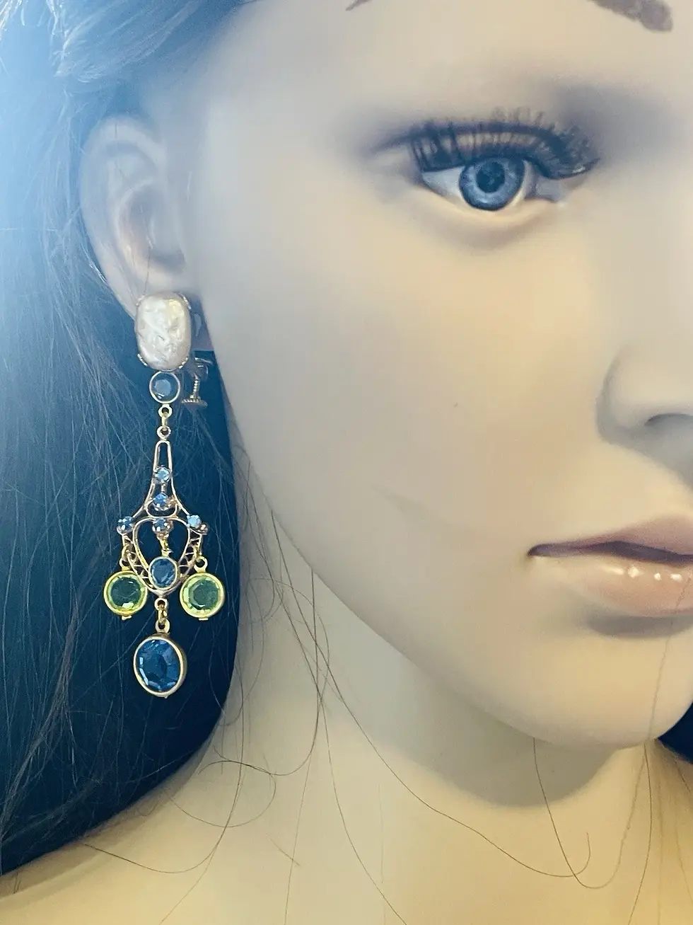 Vintage Miriam Haskell Sapphire Blue & Green Crystal Chandelier Clip On Earrings