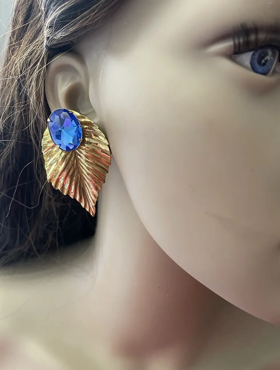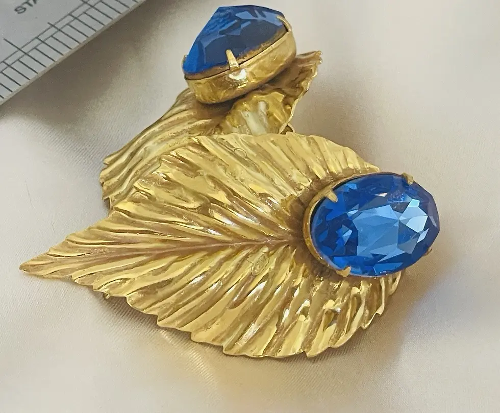 Vintage Miriam Haskell Sapphire Blue Rhinestone Gold Gilt Leaf Clip On Earrings