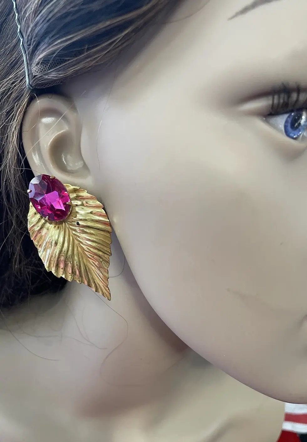 Vintage Miriam Haskell Fuchsia Dark Rose Rhinestone Gold Gilt Leaf Clip On E