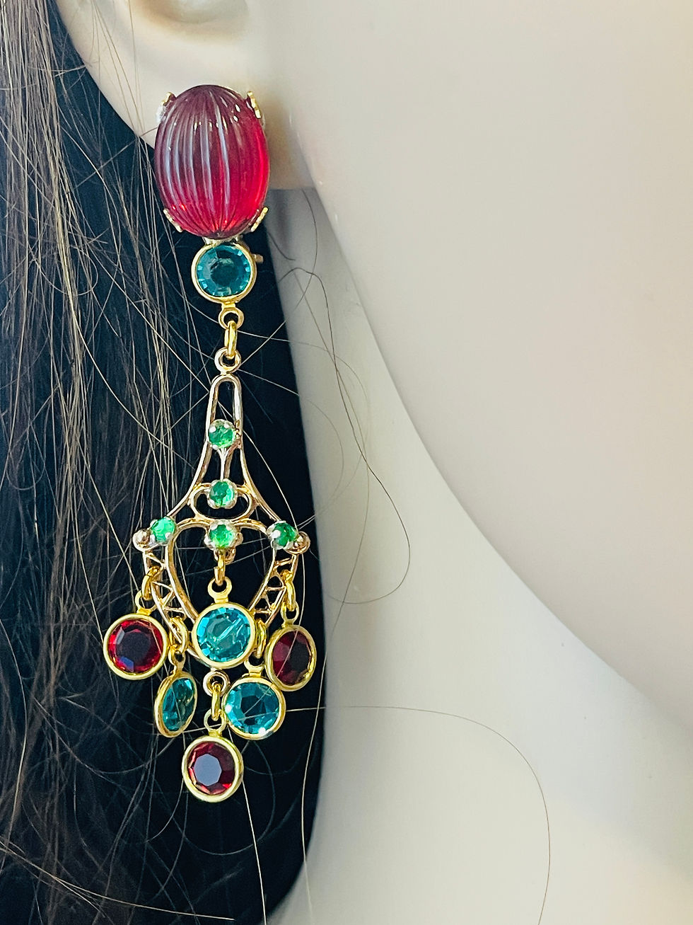 Vintage Miriam Haskell Emerald Green - Siam Red Crystal Chandelier Earrings