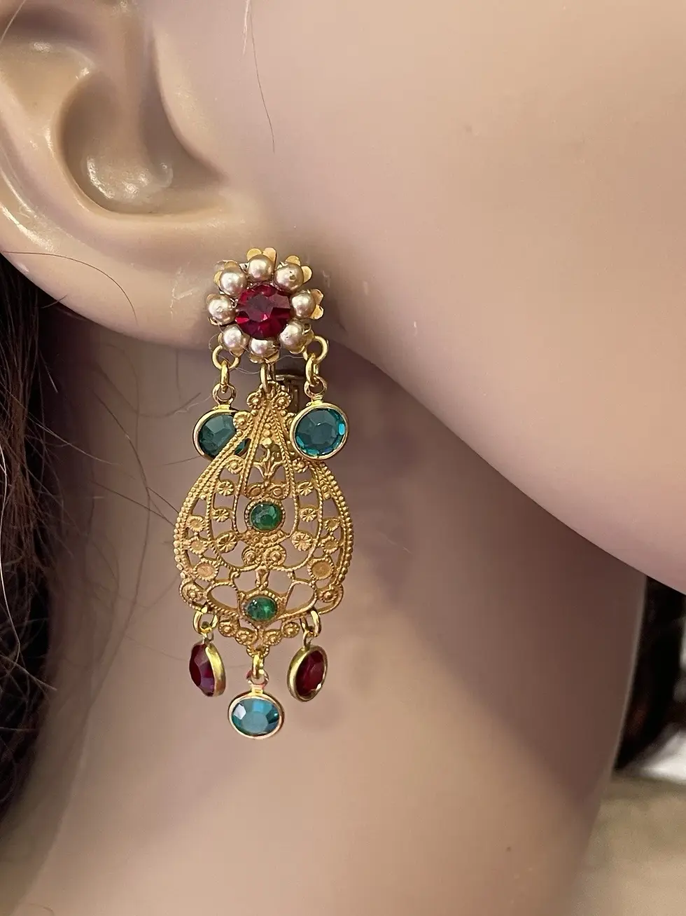 Vintage Miriam Haskell Emerald Green Siam Red Gold Gilt Clip On Earrings