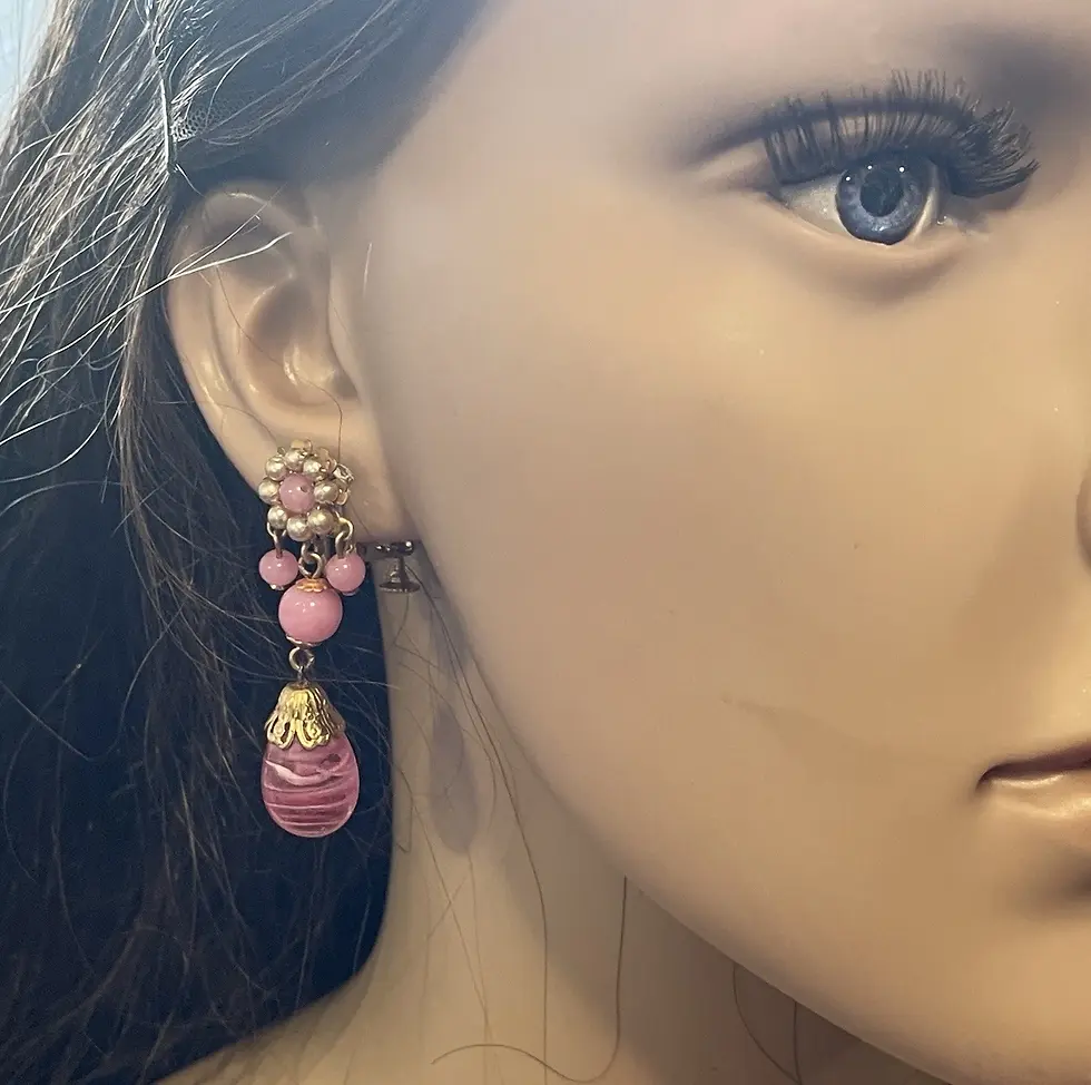 Vintage Miriam Haskell Baroque Art Glass Rose pink Clip On Earrings